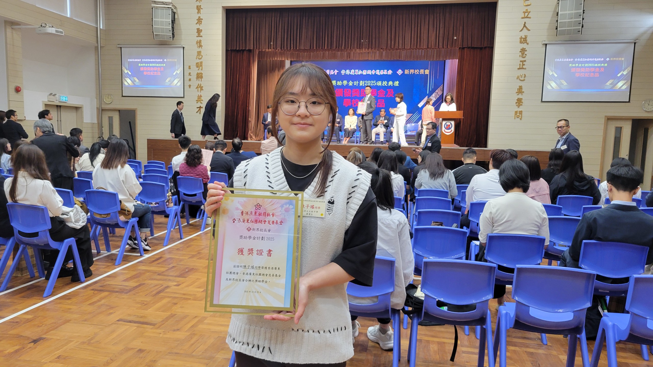 校友陳子瑤(2025畢業)獲頒香港廣東社團總會慈善基金及新界校長會獎助學金$10,000。此獎學金為鼓勵於中學文憑試考獲優良成績的學生。陳校友現於香港理工大學修讀社會科學學位課程。